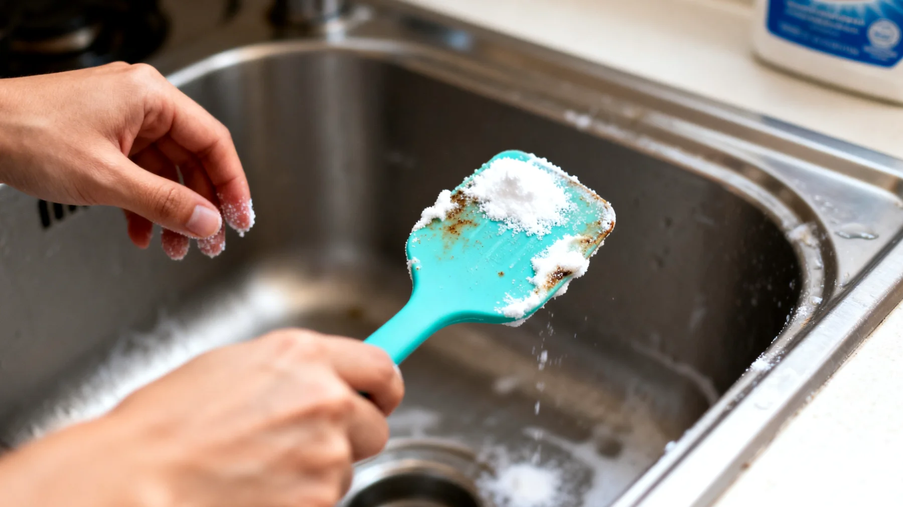 Wie in mehreren Reinigungs-Ratgebern beschrieben wird, löst man in heißem Wasser – nicht kochend, etwa 70 Grad Celsius – einen Esslöffel Natron und den Saft einer halben Zitrone oder einen Teelöffel Zitronensäure auf. Der Spatel bleibt 30 Minuten darin. Natron erzeugt eine leicht alkalische Umgebung, die Fettbindungen spaltet, während Zitronensäure als milder Chelatbildner Pigmente löst. Danach wird der Spatel mit warmem Wasser abgespült und an der Luft getrocknet. Diese Methode nutzt die chemische Komplementarität der beiden Substanzen: Während Natron die basische Komponente liefert, sorgt die Zitronensäure für einen milden sauren Ausgleich.